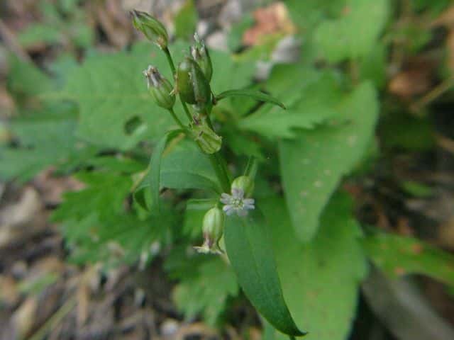 | 多年草 北海道〜沖縄。茎は高さ60〜80cm、分枝し、無毛。葉は長楕円状倒披針形から線状披針形、長さ4〜7cm、鈍頭または鋭頭、全縁、縁と中肋に沿って細毛がある。花柄は12〜20mm。萼は鐘形、長さ6.5〜8mm、無毛。花弁は小さく白色、開出部は2〜3mm、先は2浅裂。花柱3、雄ずい10。さく果は卵形8〜9mm、先は5裂し、柄は1.5mm。種子は腎形、黒褐色、0.7〜1mm、小突起がある。花期は7〜9月。(原色日本植物図鑑) 学名は、Silene firma ナデシコ科マンテマ属 |