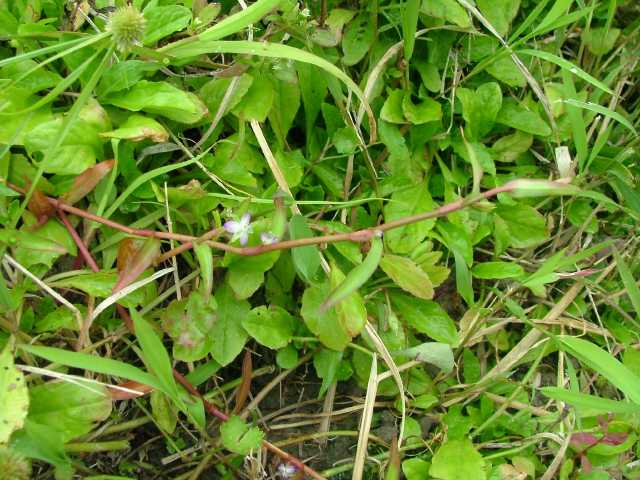 1年草 北海道〜沖縄の湖沼やため池、河川、水路、水田などに生育する湿性〜抽水植物。沈水状態で生育することもある。茎の下部は這って分枝しながら伸長し、枝が斜上して高さ20〜30cmになる。茎は赤みがかる。葉は互生で基部は長さ0.5〜1.2cmの葉鞘となり茎を抱く。葉身は挟披針形で長さ2〜7cm、幅4〜10mmで質は軟らかい。沈水状態では葉は明るい緑白色で質薄く、長さ約9cmになる。葉腋に1(〜2)個ずつ花弁の先端部がピンク色に色づく花が咲く。花弁は3枚、雄しべ3個、他に3個の仮雄しべ。雌しべは1個、子房は3室からなる。果実は柄の先に垂れ下がるようにつき、楕円形で長さ6〜10mm、成熟すると先が3裂して種子が落ちる。花期は8〜10月。(日本の水草) 学名は、Murdannia keisak ツユクサ科イボクサ属 |