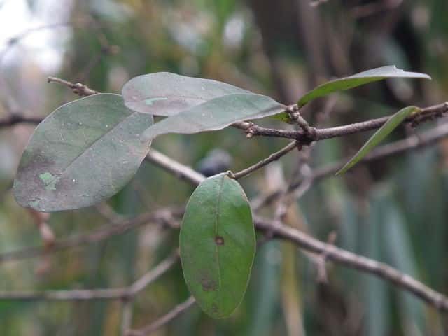 | ▼裏面主脈上に毛がある。 | ▼若い枝には細毛がある。 | ▼幹に枯れ枝が刺状に残る。 |