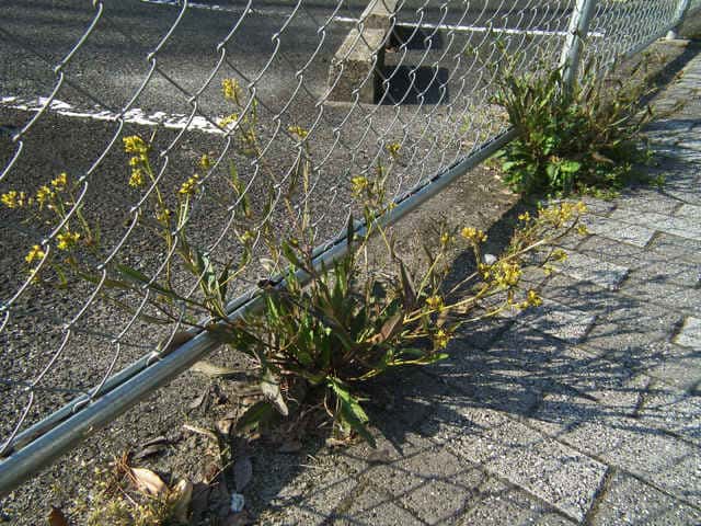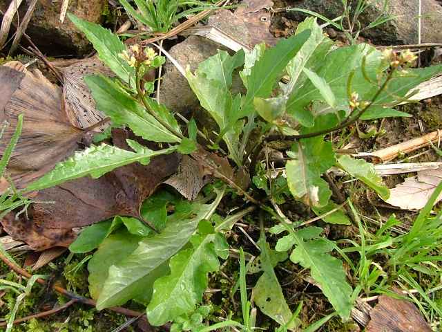 | 1〜越年草 北海道〜琉球の低地のへりや道ばたなどに多い。茎は直立して分枝し、高さ10〜60cmになる。葉は柄がないかまたはあり、長楕円状披針形〜卵形、先は鈍形、基部は細くなり、上部のものではやや耳状となって半ば茎を抱き、縁に粗い鋸歯があるか頭大羽状に分裂し、長さ3〜15cm、幅1〜5cm、毛はない。萼片は長楕円形、2.5〜3.5mm。花弁は黄色、長倒卵形で長さ3〜4mm、ときに退化する(アオイヌガラシ)。長角果は開出する長さ3〜12mmの柄があって線形、斜上または開出して先は少し上向きに曲がり、長さ1〜2.4cm。種子はやや2列に並び、卵形か楕円形、褐色で、長さ0.5〜0.7mm。花期は4〜9月。(日本の野生植物) 学名は、Rorippa indica アブラナ科イヌガラシ属 よく似たスカシタゴボウは、果実が5〜8mmと短く、葉が深く切れこむ。 |