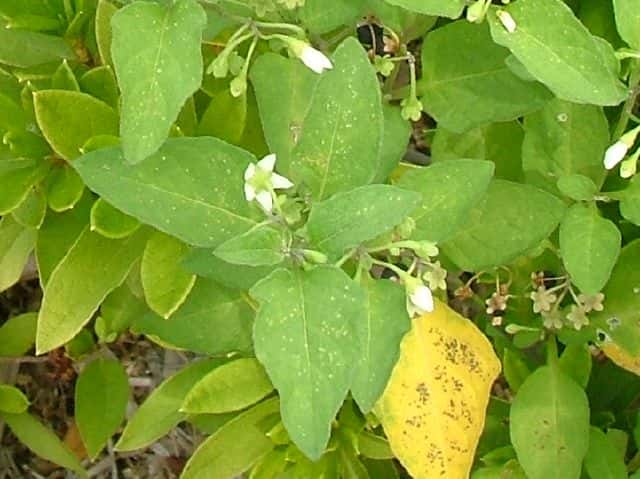 | 1年草 日本全土の畑や道ばたに生える。高さ30〜60cm。葉は互生し、長さ3〜10cmの広卵形で、縁にはふつう波形の鋸歯がある。茎の途中から枝を出し、直径6〜7mmの白い花を4〜8個やや総状につける。萼は杯状で浅く5裂する。花冠は深く5裂して反り返る。液果は直径0.7〜1cmの球形で黒色に熟し、光沢はない。種子は長さ約2mm。花期は8〜10月。(野に咲く花) 学名は、Solanum nigrum ナス科ナス属 イヌホオズキの仲間はよく似ており区別が難しい。 |