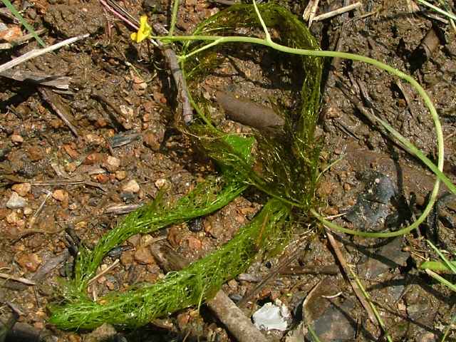 | 多年草 北海道〜沖縄の貧栄養〜腐食栄養の湖沼やため池、水田やその側溝などに生育する浮遊植物。茎は細く直径0.3〜2mm、全長は約1mに達する。葉は 長さ1.5〜4.5cm、基部で2本の枝に分かれ、更に互生状に何回か分枝する。捕虫嚢は多いが、環境条件(ハスの葉の陰など)によって捕虫嚢の少ない植物体も見かける。花茎は長さ10〜30(50)cmで、3〜10花、花茎はしばしば茎より太く、断面は中実。花柄は長さ0.5〜3cmで果実期には湾曲して下向する。花弁は黄色、距は下唇より短く鈍頭。果実は球形で直径4mm。ただし雄性不稔で結実しない集団も報告されている。秋以降、側枝の先端と頂端に殖芽を形成する。殖芽は長楕円形で暗褐色、長さ4〜10mm、幅3〜7mm。殖芽葉は中軸が不明で不規則に分裂し刺毛が顕著。花期は7〜9月。(日本の水草) 学名は、Utricularia australis タヌキモ科タヌキモ属 タヌキモとイヌタヌキモは区別が難しいが、タヌキモは冬の殖芽の色が濃緑色卵球形で、イヌタヌキモは茶褐色紡錘形。また花茎の断面に前者は中心に直径1mm程度の穴があるが、後者は穴がなく中実となる。また、ノタヌキモは葉が3個ずつつき、イヌタヌキモは2個つく。 |