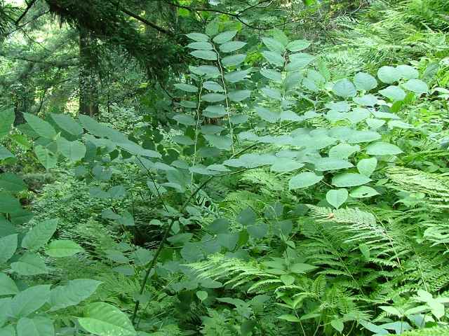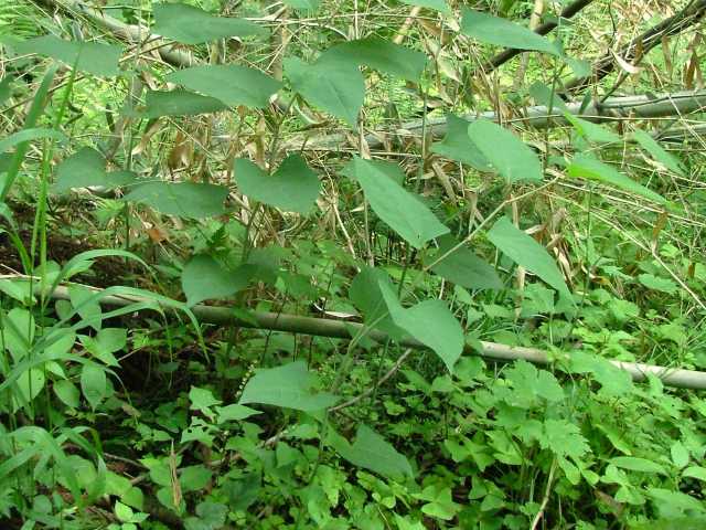 | 多年草 北海道南部〜九州の日当たりのよい荒地や斜面に生える。根茎は発達し、横にはって広がり、新しい苗を出す。茎は下部で直立し、上部は斜上して多くの枝に分かれ、高さ20〜150cm、まれには3mを超えることもあり、基部では径2.5cmに達する。葉は有柄、広卵状楕円形〜広卵形、先は尾状の鋭尖形、基部は切形まれに浅心形、長さ6〜15cm、幅5〜12cm、両面無毛か表面脈状に細突起がある。托葉鞘は膜質、早く落ちやすい。雌雄異株。偽総状花序は茎頂および葉腋から出た花序軸に多数開出してつき、全体として円錐状の花序をつくる。花序軸には細毛がある。花柄は花時3〜4.5mm、基部から1/3ほどの場所に関節があり、果時には伸びて6mmに達する。萼は白色または乳白色でときに赤みをおび、長さ1.5〜3mm。萼は5裂する。雄花では萼は深裂して裂片は開出し、雄しべは8個、萼より長く、雌しべはふつう発達しないが、一部の花では発達して両性花となる。柱頭は3個、先端が房状に細裂する。雌花では萼は中裂して裂片はあまり開かず、果時に大きくなり、外側の3裂片は背面に翼を出し、全体は倒卵形となって先は凹み、長さ5〜10mmとなる。そう果は3稜形、黒褐色で光沢があり、長さ約2.5mm。花期は7〜10月。(日本の野生植物) 学名は、Fallopia japonica var. japonica タデ科ソバカズラ属 |