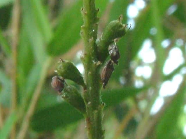 | ▼果序は長さ約16cm。 | ▼果実は長さ約9mm、いぼ状腺点がある。 | ▼果実の先端に小さな突起がある。 |