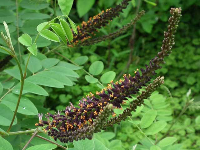 | 落葉低木 北アメリカ原産。道路の法面の緑化や砂防用に植栽されている。崩壊地や河原などには野生化している。高さ2〜5mになる。樹皮は灰褐色。葉は互生。長さ10〜30cmの偶数または奇数羽状複葉で、小葉は5〜10対ある。小葉は長楕円形〜卵形で全縁。裏面に腺点がある。枝先に長さ6〜20cmの穂状花序を数個伸ばし、長さ約8mmの黒紫色の花を多数つける。花弁は旗弁のみで、翼弁と竜骨弁は退化している。旗弁は濃紫色。花糸は紫色で葯は黄色。果実は豆果。長さ約1cmで、裂開しない。表面には水泡状のいぼがある。種子は1個、長さ約4mm。花期は5〜6月。 冬芽は卵形で枝に伏生してつく。芽鱗は3〜5個。主芽と葉痕の間に副芽がある。(樹に咲く花) (果実は長さ6〜10mm、幅2〜3mm、微湾曲、先端に小さな突起があり、表面に隆起したいぼ状の腺点がある。・・中国植物誌) 学名は、Amorpha fruticosa マメ科イタチハギ属 |