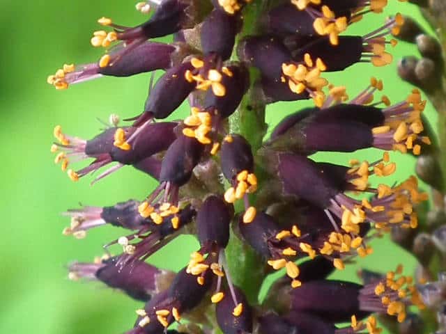 | ▼花弁は旗弁のみがある。 | ▼花弁を除く。雄しべ10個、雌しべ1個。 | ▼雄しべの花糸は紫色、葯は黄色。 |