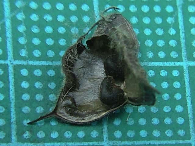 | ▼種子は長さ約3.5mm。 | ▼表面に刺状の毛がある。 | |
