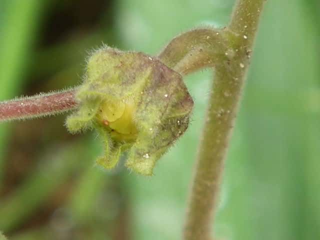 | ▼高さ15cmくらいの小さなもので、蕾の状態しか確認できていない。黄色の5弁花。蕾を開いて見ると、発育の悪いイチビのようだ。 | ||