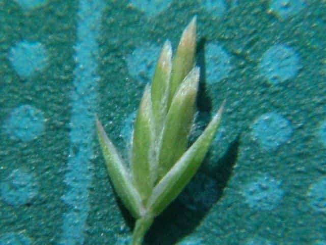 | ▼3小花の小穂は長さ約4.5mm。 | ▼第1苞穎は長さ約2.5mm、第2苞穎は2.7mm。 | ▼小花の護穎の基部に長い縮れ毛がある。 |