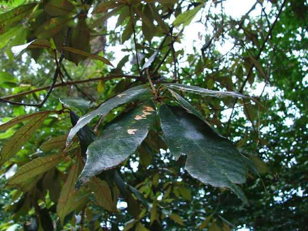 | 常緑高木。 関東地方南部以西の太平洋側〜九州の山地に生える。高さ30m、直径1.5mほどになる。樹皮は暗褐色〜灰黒色。本年枝や2年枝には黄褐色の星状毛が密生し、縦に走る溝がある。3〜4年枝では星状毛は落ち、黒褐色や灰黒色。円形の皮目がある。葉の裏や堅果には黄褐色の星状毛が密生する。葉は互生。葉身は長さ6〜14cm、幅2〜4cmの倒披針形で、革質。上半部には鋭い鋸歯がある。表面は濃緑色で光沢がある。はじめは黄褐色の垢状の毛が密生するが、すぐに落ちる。裏面には黄褐色の星状毛が密生し、成葉になっても残る。主脈は裏面に突出する。葉柄は長さ1〜1.5cm。托葉は長さ1cmほどの線形で黄褐色の毛が密生する。開葉後まもなく落ちる。雌雄同株。長さ5〜16cmの雄花序が新枝の下部から数個垂れ下がる。花序の軸には褐色の星状毛が密生する。雄花は苞のわきに1個つく。苞は褐色で長さ3mmほどの卵形。雄しべは7〜10個。雌花序は新枝の上部の葉腋に直立し、雌花が数個つく。花柱は3個。扇形で先端はそり返る。果実は堅果。直径1〜1.3cmの卵球形で、その年の秋に成熟する。下部は同心円状の環が6〜7個並んだ殻斗に包まれる。殻斗には星状毛が密生する。花期は4〜5月。 冬芽は長楕円形。(樹に咲く花) 学名は、Quercus gilva ブナ科コナラ属 |