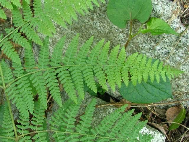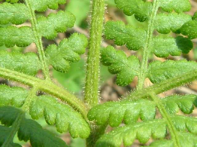 | 夏緑性シダ植物 本州〜九州の低山の開墾地や伐採地など日当りのよい荒地に生える。根茎は長く這う。葉柄はわら色で下部では暗褐色となり、全面に毛が生える。葉身は三角状長楕円形の3回羽状複葉で表裏面とも毛が生える。ソーラスは小型の円形で小羽片の辺縁近くにつき、包膜はない。 学名は、Hypolepis punctata コバノイシカグマ科イワヒメワラビ属 |