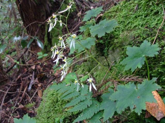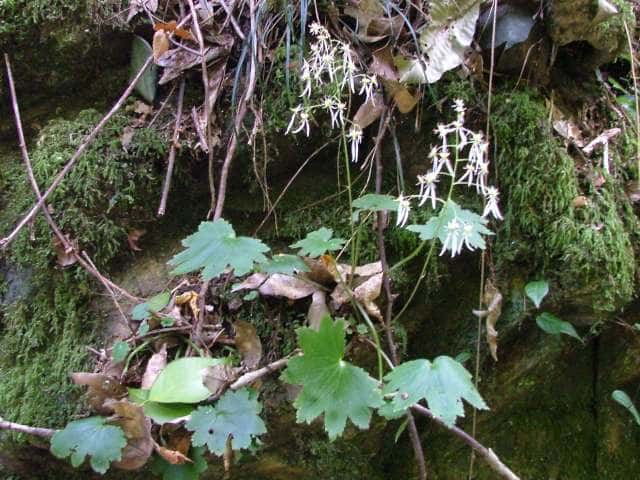 | 多年草 関東以西〜九州の山の日陰の斜面や岩上に生える。葉は5〜20cmの葉柄があって根生し、長さ2〜17cm、幅3〜19cm、7〜11浅〜中裂し、花茎と共に全体にまばらに毛がある。葉中にルーペで見られる針状結晶がある。高さ10〜35cmの花茎の先に約3mm、基部には爪があり、1個の黄斑がある。下側の2個は長大で長さ1.5〜2.5cmに達する。雄ずいは10個、葯は橙色。花床は黄色で子房の上半だけをつつむ。種子は長楕円形、微小な乳頭状凸起がある。花期は9〜10月。(原色日本植物図鑑) 学名は、Saxifraga cortusaefolia ユキノシタ科ユキノシタ属 |