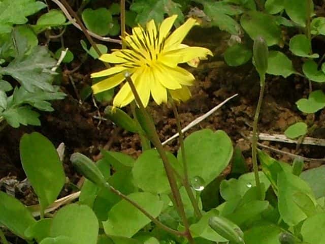 | 多年草 日本全土の山野の日当たりのよいところに生える。細長い茎が地面をはい、ところどころで根を下ろしてふえる。葉は薄く、長い柄がある。葉身は長さ0.9〜3cm、幅0.8〜2.5cmの卵円形〜広卵形。花茎は高さ8〜15cmになり、直径2〜2.5cmの黄色の頭花を1〜3個つける。総苞は長さ0.8〜1cmの円柱形。内片は1列に並び、外片は小さい。そう果は4〜6mmの紡錘形。やや扁平で先が細長いくちばし状になる、別名ジシバリ。花期は4〜6月。(野に咲く花) 学名は、Ixeris stolonifera キク科ノニガナ属 よく似た花にオオジシバリがあるが、葉はへら形となる。 |