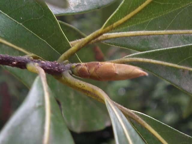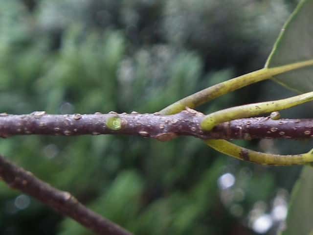 | ▼裏面は灰白色。 | ▼若い枝には皮目が多い。 | |