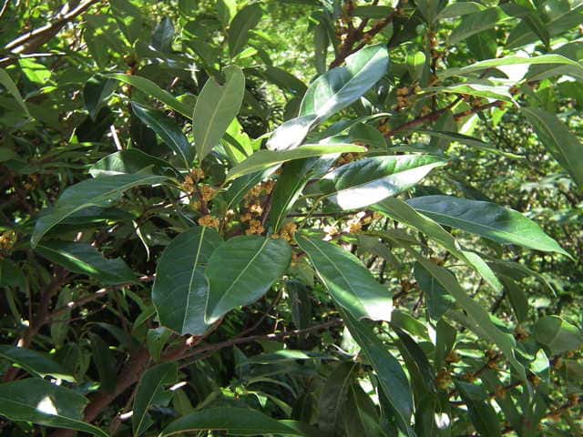 | 常緑高木 関東地方・福井県以西〜九州の暖地のタブノキ林やシイ林、カシ林に混生する。高さ22mほどになる。円形の樹形をつくる。樹皮は灰黒色。樹皮がまるい薄片になってはがれ落ち、その跡が白い鹿の子模様になる。新枝は褐緑色、細くて無毛。葉は互生。枝の上部に集まってつく。葉身は長さ5〜9cm、幅1.5〜4cmの倒披針形または倒卵状長楕円形。先端は鈍く、基部広いくさび形、ふちは全縁。薄い革質で、表面には光沢がある。裏面は灰白色、はじめ長い毛があるが、のちに無毛。葉柄は長さ8〜15mm。雌雄別株。葉のわきに淡黄色の花が集まって咲く。花序は無柄で、総苞片が4個ある。雄花序の総苞片は長さ3.5〜4mmの楕円形。雌花序の総苞片は少し小さく、花の数も雄花序より少ない。花被は有毛で、上部は6裂する。雄花の雄しべは9個、花被から長くつきでる。葯は4室。雌花には雌しべ1個と葯が退化した仮雄しべが9個ある。果実は液果、直径約7mmほどの倒卵状球形で、翌年の秋に赤く熟す。種子は球形〜卵状球形、淡褐色で上半部に黒褐色のまだら模様がある。花期は8〜9月。 冬芽の葉芽は細長い披針形。花芽は球形で葉の脇に3〜4個ずつつく。(樹に咲く花) 学名は、Litsea coreana クスノキ科ハマビワ属 |