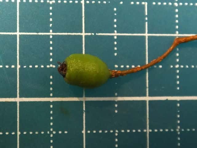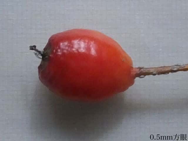 | ▼果柄にイボ状の皮目が多い。 | ▼果実は長さ約1cm、直径約8mm。 | |