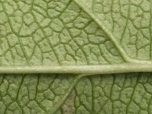 | ▼葉は長さ約7cm、先は鋭く尖る。 | ▼若葉は両面とも毛がある。 | |
