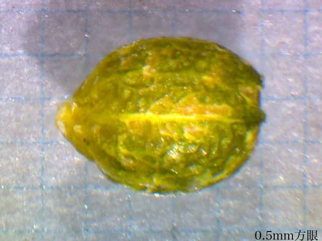 | ▼乾燥すると網目状の脈が浮き出る。 | ▼薄い果皮の中に種子が1個ある。長さ約2.2mm、網目状の脈がある。 | |