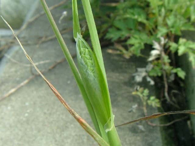 | ▼小穂は長さ約8mm、光沢のある小花がある。 | ▼包穎の背部に半月形の翼がある。 | ▼小花の基部に2個の退化した小花の穎がある。 |
