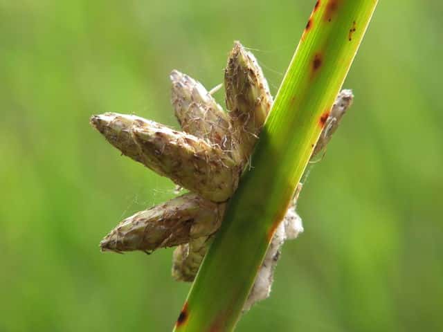 | ▼茎の先に短い苞がつく。 | ▼小穂は長さ約1.8mm。 | ▼果実は長さ約2mm。 |