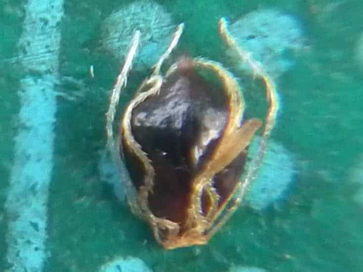 | ▼鱗片の上縁に歯牙状の突起が並ぶ。 | ▼刺針状花被片は果実の長さの2倍程度。 | ▼刺針状花被片には下向きの刺がある。 |