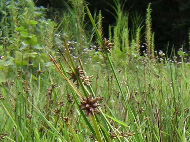 多年草 北海道〜九州の池沼などの湿地に多い。植物体は叢生し、ときに短い横走根茎を持つ。稈は高さ50〜120cm、横断面は鋭3稜形、平滑、濃緑色。花序は側生し、無柄の小穂が4〜20個集まって頭状をなす。苞葉の葉身は稈に続き、長さ3〜10cm、斜上する。小穂は長卵形、長さ1〜2cm、鋭頭、淡緑色。鱗片は密に圧着し、卵形、長さ4〜5mm、上部の縁はざらつく。葯は線形で長さ約2.5mm。そう果は広倒卵形長さ2〜2.5mm、横断面は扁3稜形。刺針状花被片は5〜6本、長さはそう果の1.5〜2倍、下向きにざらつく。柱頭は3個。花期は7〜10月。(岡山県カヤツリグサ科植物図譜) 学名は、Schoenoplectus triangulatus カヤツリグサ科ホソガタホタルイ属 よく似たサンカクイは、花序に柄がある。 |