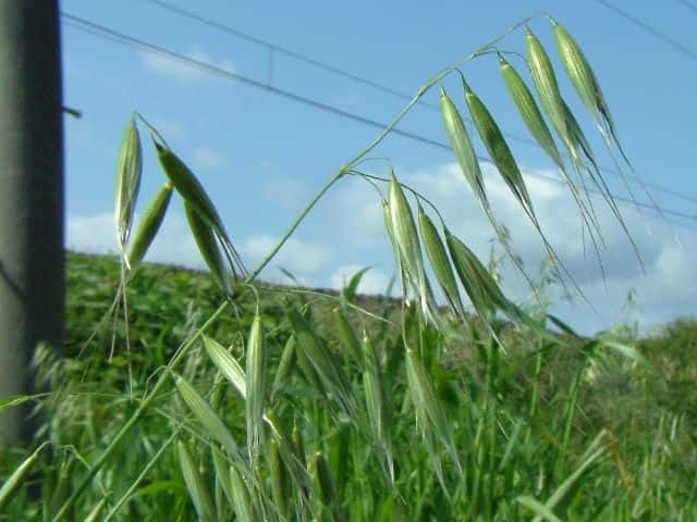 | 1〜越年草 ヨーロッパ原産。本州〜沖縄の路傍や荒廃地に生育し、散生またはやや群生する。茎は中空、直立・叢生する。高さ60〜80cm。葉の長さ10〜25cm、幅4〜6mm。無毛。葉舌は鈍形、不規則に細裂する。葉鞘は無毛。花序はまばらな円錐形、長さ10〜20cm。小穂は長楕円形、長さ20〜25mm、2〜3個の小花からなる。苞穎は大きく、長さ20〜23mm。護穎は黄褐色、粗い長毛があリ、背面に暗褐色の屈曲した芒をつける。果実は長楕円形、腹面は扁平、淡黄褐色の毛が生え、長さ7〜8mm。花期は6〜7月。(日本イネ科植物図譜) 学名は、Avena fatua イネ科カラスムギ属 護頴に毛のないタイプをコカラスムギということもあるが、区別しないのが普通だという。 ミナトカラスムギは護穎の先端が深裂し芒状になる。 似たものにマカラスムギがあり、芒が1本あるか又は全くない。 |