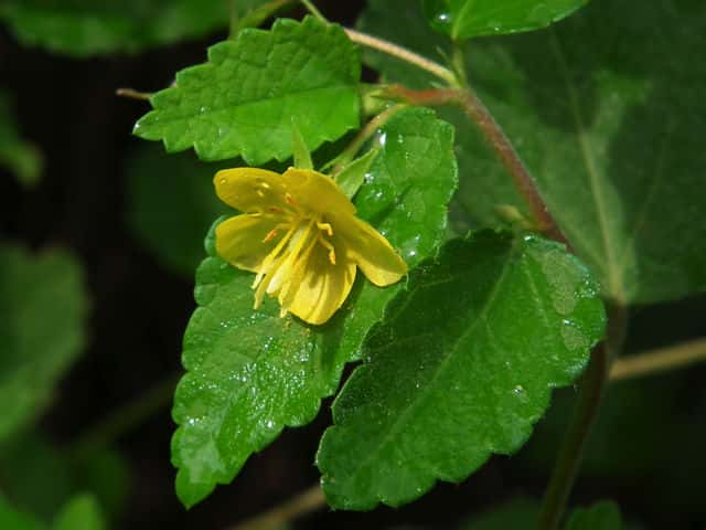 | 1年草 東北南部以西〜九州の畑や道ばたなどに生える。茎は丸くて直立し、高さ30〜60cm。茎葉に星状毛がある。葉は互生し、卵形で先はややとがり、基部は円形または切形、長さ2〜7cm、幅2〜4cm、鈍鋸歯があり、柄は長さ1〜2cm。葉腋に1個の黄色の花がつく。花柄は長さ1.5〜3cm、萼片は線状披針形で長さ6〜8mm。先はとがり、反曲し、外面に星状毛がある。花弁は倒卵形、長さ7〜10mm。仮雄蕊は長さ7〜9mm。子房は3室。さく果は長さ2.5〜3.5mm、幅約3mmで少し湾曲し、星状毛がある。種子は卵形で長さ3mm以下、横に隆起線がある。花期は8〜9月。(日本の野生植物) 学名は、Corchoropsis crenat アオイ科カラスノゴマ属 |