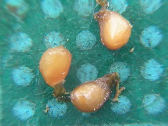 | ▼落下した果実の横断面。多数の種子が入る。 | ▼果実の縦断面。 | ▼種子は長さ約1.8mm。 |