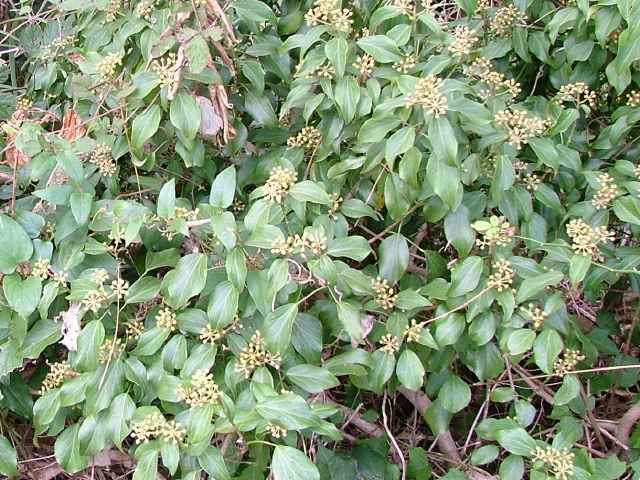 | 常緑つる性木本 本州〜九州の照葉樹林の林縁や林内、原野などに生える。気根をだして、樹木や岩の上などにはい登る。大きいものは太さが直径6cm以上になる。樹皮は灰色で皮目がある。本年枝は緑色。はじめ黄褐色の微細な星形の鱗状毛があるが、のち無毛になる。葉は互生。葉身は長さ3〜7cm、幅2〜4cmの三角形または五角形状で、基部は切形またはハート形。花序のつく枝の葉は倒卵形または楕円形で、分裂しない。ふちは全縁。花のつかない枝の葉は浅く3〜5裂する。革質で、表面は光沢がある。若い葉にははじめ褐色の小さな星形の鱗状毛があるが、のちに無毛になる。枝先に直径2.5〜3cmの球形の散形花序を1個または数個だし、黄緑色の小さな花を多数つける。花は直径1cmほどで、花弁は5個、長さ約4mmの長卵形でそり返る。花盤は暗紅色。雄しべは5個。葯は黄色で裂開すると褐色になる。萼筒は鐘形、鱗状毛が生える。果実は液果。直径8〜10mmのほぼ球形、はじめ赤紫褐色で、翌年の5〜6月に紫黒色に熟す。先端には花柱が残る。直径約5mmの扁球形の種子が5個入っている。花期は10〜12月。別名 フユヅタ。 冬芽の頂芽は半球形またはやや扁平な三角形で、紅紫色を帯びる。側芽は小さくて丸みのある扁平な三角形。葉痕葉三日月形、維管束痕は5個。(樹に咲く花) 学名は、Hedera rhombea ウコギ科キヅタ属 よく似たセイヨウキヅタは、若い葉柄や葉裏に長くて白い毛がある。 |