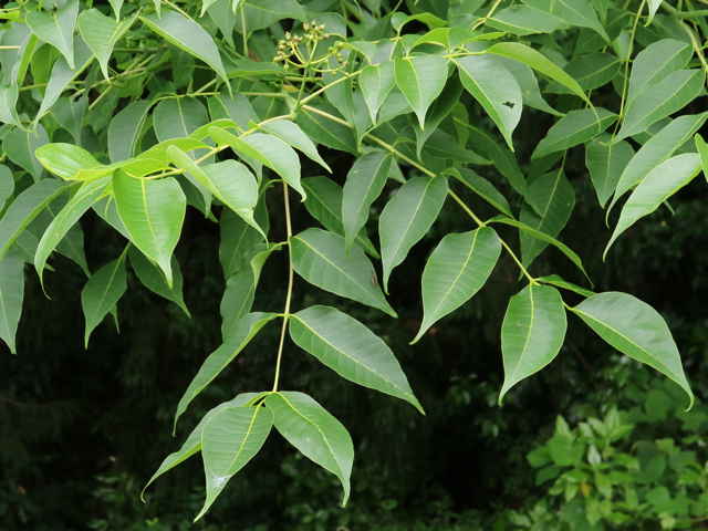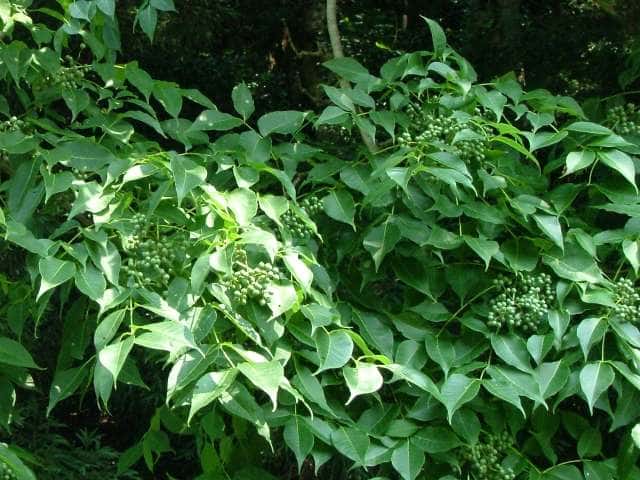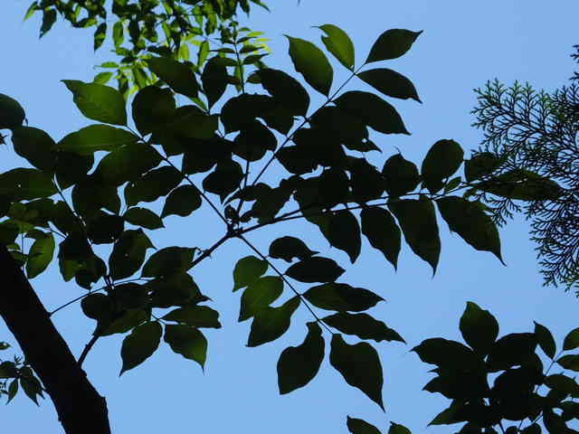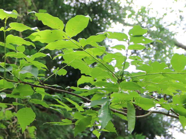 落葉高木 北海道〜九州の山地の沢沿いの林内に生える。高さ20mほどになる。樹皮は灰黒色または黒褐色。縦長の溝がある。若い枝は赤褐色〜黄褐色。無毛で縦に長い皮目がある。内樹皮は鮮黄色。葉は対生。長さ20〜40cmの奇数羽状複葉。小葉は2〜6対あり、長さ5〜10cm、幅3〜5cmの卵状長楕円形。先端は尾状に鋭く尖り、基部は円形〜広いくさび形。ふちには浅い鈍鋸歯がある。裏面の主脈の基部付近には長毛が密生する。葉柄や葉軸は無毛または一部に短毛が生える。雌雄別株。枝先に円錐花序を出し、小さな黄緑色の花を多数つける。花弁は5個、長さ約4mmの長楕円形、内面には毛が生える。果実は核果。直径1cmほどのほぼ球形で、9〜10月に黒く熟す。なかには核が5〜6個入っている。核は長さ4〜5mmの楕円形、表面には微細な凹凸がある。花期は5〜7月。 冬芽は葉柄内芽。冬芽は葉柄の基部に包まれていて、秋に葉が落ちると現れる。長さ2〜4cmの半球形。枝の先端には仮頂芽が2個向い合ってつく。葉痕は大きく、冬芽をぐるりと取り囲む。側芽は対生する。 学名は、Phellodendron amurense ミカン科キハダ属 |