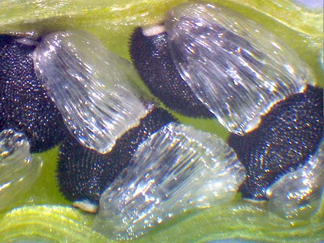 | ▼果実には種子が2列に並んでいる。 | ▼種子には膜状の種枕がついている。 | |