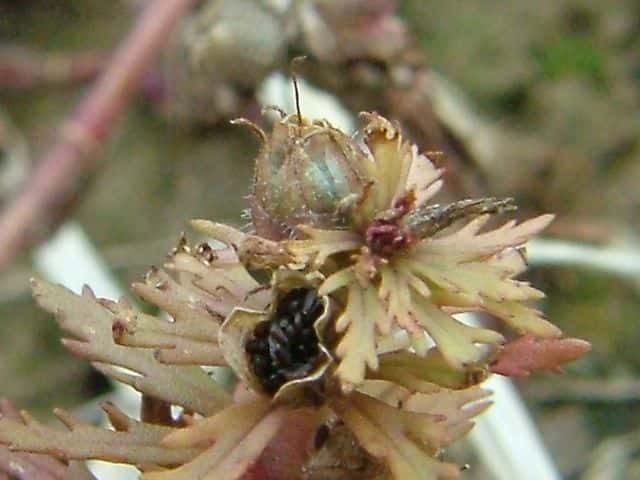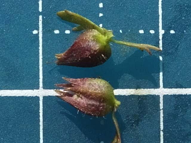 | ▼果実を包む萼は長さ約5mm。 | ▼萼を半分除くと、中に果実がある。 | |