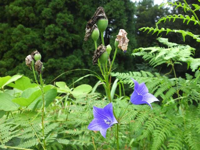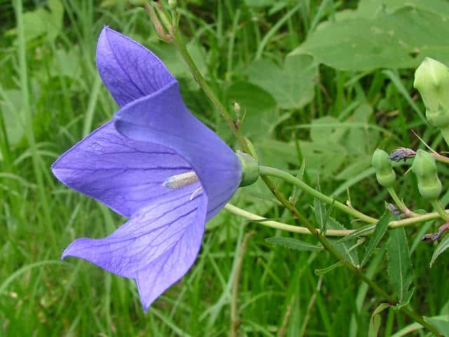 | 多年草 北海道〜九州の山野の草地に生え、太い根茎は深く地中に入り、茎は高さ40〜100cm、ときに上方が分枝する。葉は互生、ときに対生または輪生、卵形〜狭卵形で長さ4〜7cm、先はとがり、無柄かまたはごく短い柄があり、縁に鋭鋸歯がある。表面は無毛、裏面は粉白色をおび、有毛〜ほぼ無毛まである。茎頂近くに数個つき、花冠は径3〜5cm、花柄があり、青紫色であるが、淡紫色や白色のものもある。花期は7〜8月。(日本の野生植物) 学名は、Platycodon grandiflorum キキョウ科キキョウ属 |