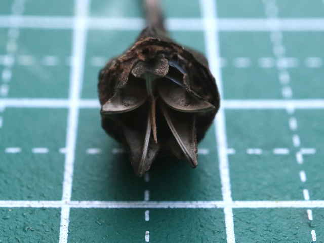 | ▼先端は5裂して種子が出る。 | ▼種子は2〜2.3mm。 | |