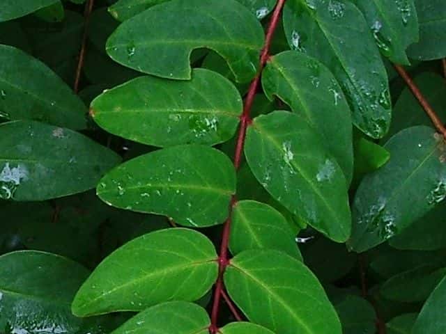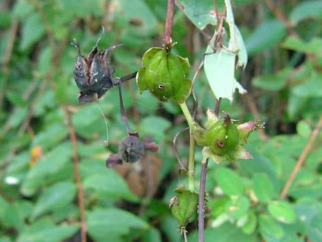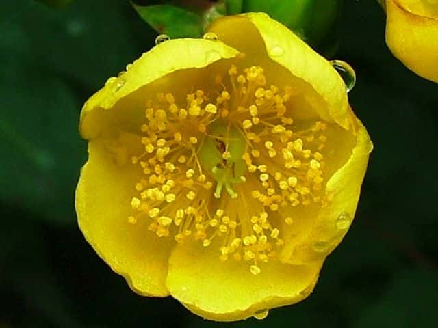 | 半常緑低木 中国中南部原産。寒冷地を除いた各地で庭木、公園樹として植えられ、花は切り花にされる。高さ約1mほどになる。葉は対生し、長さ2〜4cmの卵状長楕円形。裏面には腺点がある。枝先に花は直径3〜4cmの黄色の花をつける。雄しべは多数あり、約60個ずつ5つの束になている。果実はさく果。長さ約1cmの卵形で、熟すと5裂し、種子を多数出す。種子は長さ約0.8の円柱形。花期は。6〜7月。(樹に咲く花) 学名は、Hypericum patulum オトギリソウ科オトギリソウ属 |