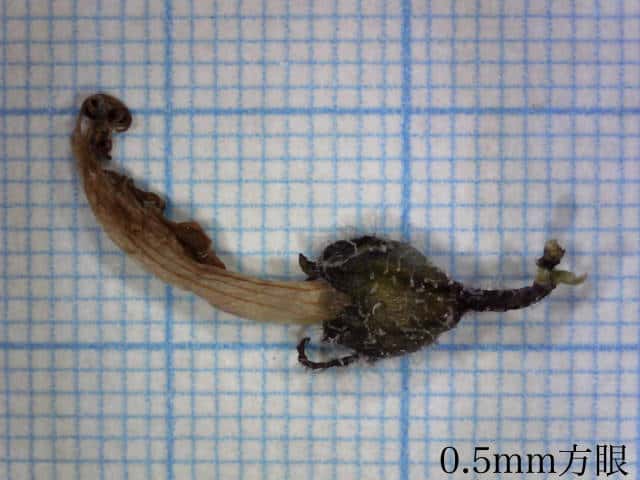 | ▼萼の中に4分果がある。 | ▼分果は長さ約1.7mm。 | ▼表面に網目模様がある。 |