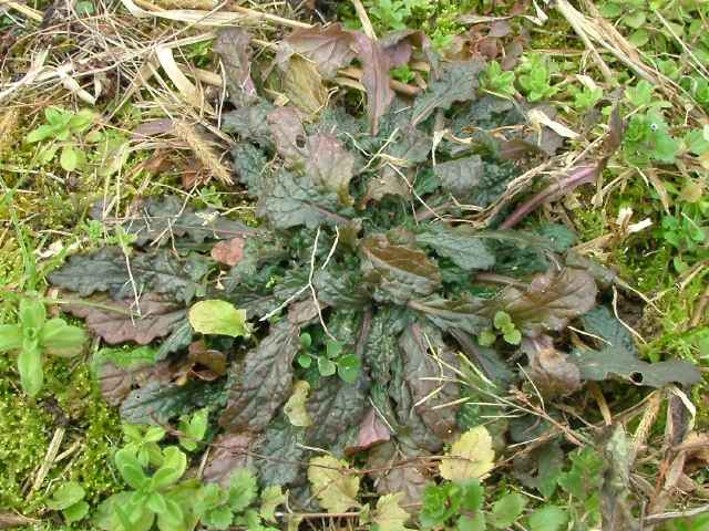 多年草 本州〜奄美大島の路傍や山麓などの陽地に生える。ロゼット葉は広倒披針形またはへら形で鈍頭、長さ4〜9cm、幅0.7〜2.5cm、鈍頭、基部は細まって、縁に波状の鈍鋸歯があり、上面は濃緑色でやや光沢があり、まばらに毛がある。茎は四方に出て地表をはうが、節より根を出すことなく、長さ5〜15cmになる。茎葉は長楕円状倒披針形、長さは柄も含め2〜6cm、幅0.5〜2cm。葉腋に濃紫色の花を2〜3個ずつつける。萼は長さ3〜4mm、全体に多細胞の縮れた毛がある。花冠は背面で長さ8〜10mm、上唇は短くて2裂、下唇は3裂して開出、中央裂片はは大きく、さらに2浅裂する。分果は卵球形で長さ1.5〜1.8mm。花期は3〜5月。(日本の野生植物) 学名は、Ajuga decumbens シソ科キランソウ属 |