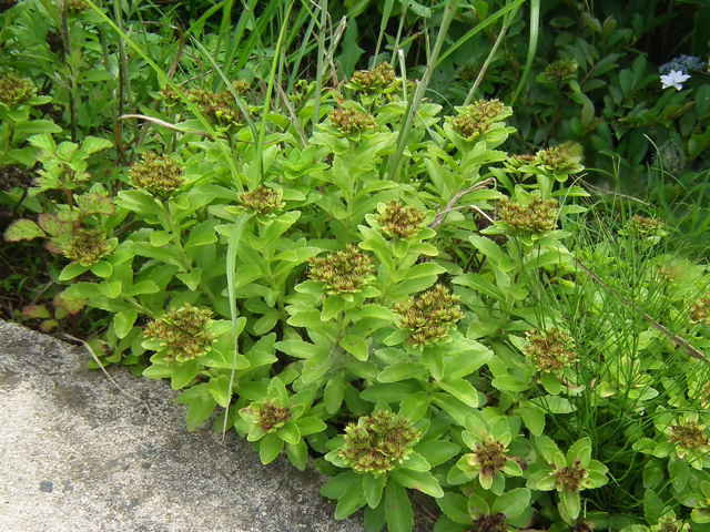 | 多年草 北海道〜九州の海岸の岩上や山地草原、林縁などに生える。高さ20〜50cm。葉は互生し、長さ2〜7cmの広倒卵形〜広倒披針形で、上半部に鈍鋸歯がある。茎頂に3出の集散花序をだし、黄色の花を多数つける。花弁は5個、披針形で長さ6〜7mm。雄しべは長さ5〜7mm。心皮5個は平開する。花期は5〜8月。(山に咲く花) 学名は、Phedimus aizoon var. floribundus ベンケイソウ科キリンソウ属 冬場は地上部は枯れ、地際に越冬芽を形成する。 |