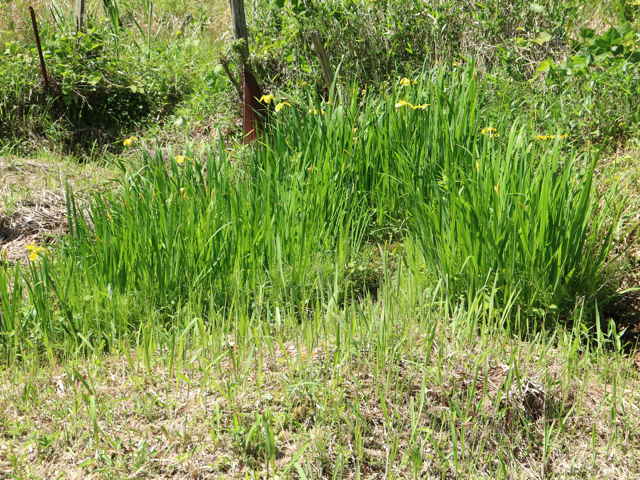 多年草 ヨーロッパ原産。明治時代に観賞用として導入された。畑でも育つが、水域での繁殖力が旺盛で各地で野生化が見られる。湖沼やため池、河川、水路などの浅水域に生育する抽水植物。太い地下茎がある。葉は2列に根生、剣状で先は細くなり鋭頭、長さ50〜120cm、幅1.5〜3cm、中央の脈は隆起して明瞭。長さ50〜120cmの花茎が立ち上がり、数個の葉状の苞のもとで分枝する。花は鮮やかな黄色。外花被片は3枚、広卵形で長さ5〜7cm、幅3〜4cm、先が垂れる。内花被片は細長く、長さ2〜3cmで立つ。果実は断面がほぼ三角形をした長楕円形で長さ4〜7.5cm、幅1.5〜2.5cm。成熟すると3裂し、銅褐色で偏平な種子が落ちる。花期は4〜6月。(日本の水草) 学名は、Iris pseudacorus アヤメ科アヤメ属 |