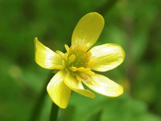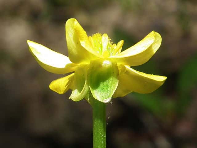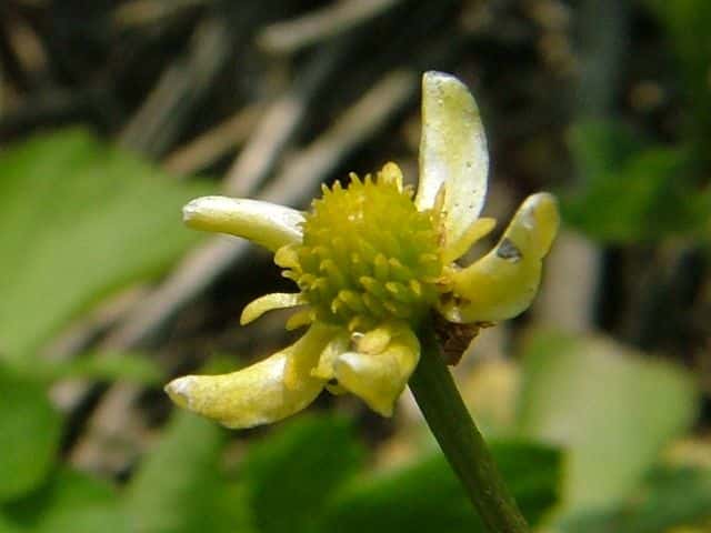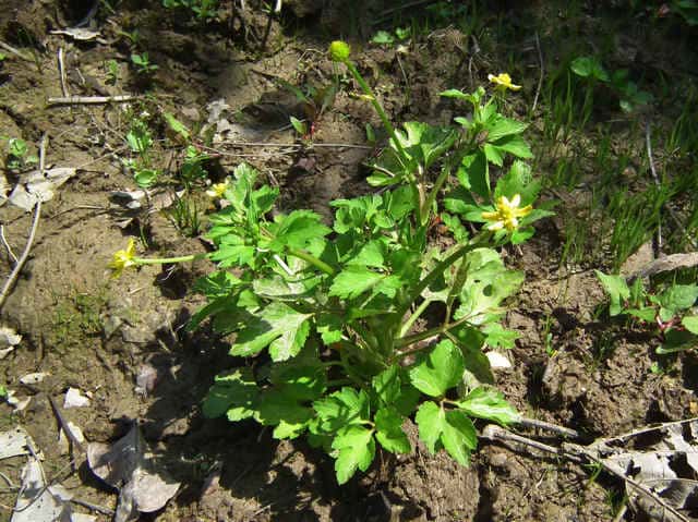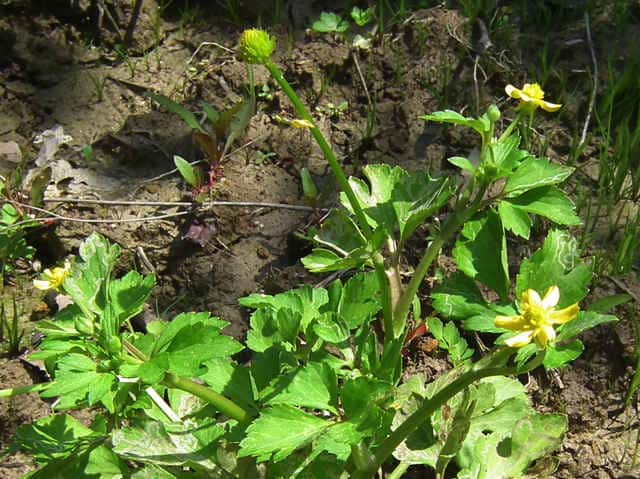 | 多年草 北海道〜九州の道ばたや溝などの湿地にふつうに生える。茎は立ち、高さ15〜80cm、斜上する毛があるかまたはやや無毛、多く分枝する。根出葉は長柄があり、幅4〜10cm、3出複葉。小葉はやや長柄があって、卵形、3深裂し、裂片にはふぞろいな鋸歯があり、両面にねた毛がある。茎葉は短柄があり、3出複葉、上部のものは、単に3深裂。花柄は1.5〜6cm。萼片は5、花時に反り返り、楕円形、長さ2.5〜4mm、背部に毛がある。花弁は5、黄色、倒卵形、長さ4〜6mm。花糸は無毛、1〜1.5mm。葯は1.5mm。集合果は球形、花床に短毛がある。そう果は広倒卵形または広卵形、やや扁平、無毛、多数あって長さ3.5〜4mm、上部の縁は扁平となり、花柱は0.8〜1.2mm、先がひどく曲がる。 花期は4〜7月。(原色日本植物図鑑) 学名は、Ranunculus silerifolius var. glaber キンポウゲ科キンポウゲ属 最近は花柱の先端の曲がり具合は同定のキーにならず、そう果の稜がキーとされる。検索表。 八重咲きのものをヤエキツネノボタンという。 茎に毛が多いものをヤマキツネノボタンとして分ける説もある。 全体に開出毛が多く、小葉の幅が狭く、鋸歯が鋭く尖るものをケキツネノボタンという。 また花がよく似て、葉が3〜5裂するウマノアシガタがある。 よく似た花。 |