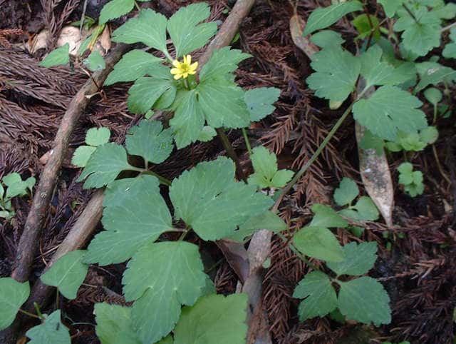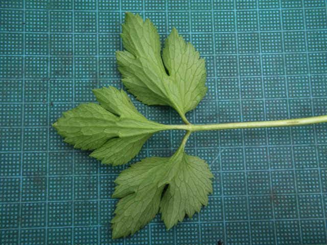 | ▼上部の葉は3深裂した単葉。 | ▼根生葉は3出複葉、長柄がある。 | ▼葉柄を含めて長さ約11cm。 |