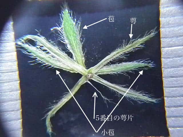 | ▼苞、2個の小苞、5深裂する萼。 | ▼5個目の萼裂片は線形で小さく、痕跡的。 | ▼萼裂片の基部。 |