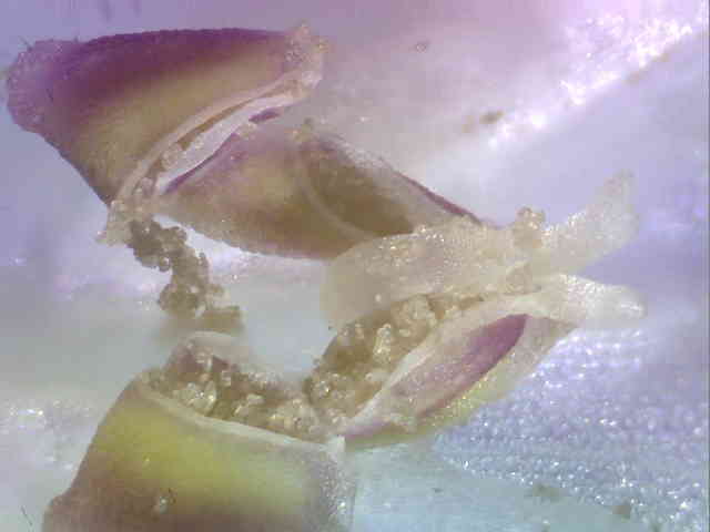 | ▼採取した果実が乾燥して裂けたもの。 | ▼種子は基部の弾糸の力で弾き飛ばされる。 | |