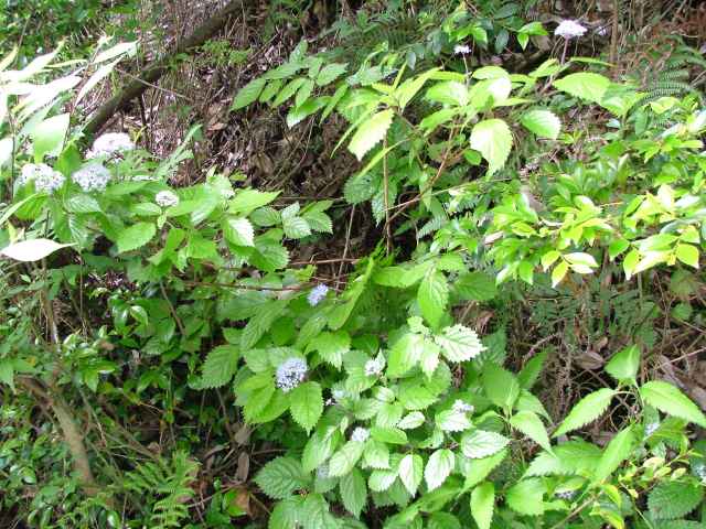 | 落葉低木 関東地方以西〜九州の山地や丘陵の明るい林内や林縁、林道沿いや伐採跡地など、山地の明るい場所ではふつうに見られる。幹は下部で分岐し、枝は横に広がり、高さ1〜2mになる。樹皮は縦にひび割れて、薄くはがれ落ちる。若枝は紫褐色で、白色の粗い毛がある。葉は対生。長さ5〜8cm、幅3.5〜6cmの卵形〜楕円形。先は鋭くとがり、基部は円形〜広いくさび形。ふちには大きな三角状の鋸歯が規則的に並ぶ。質は草質で薄く、両面とも毛が散生し、脈上にはかたい毛が密生する。葉柄は長さ1.2〜4cm。枝先に直径5cmほどの散房花序をだす。装飾花はなく、花はすべて両性花。両性花は直径約4mm、花筒は鐘形で長さ約1mm。花弁は白色〜淡青色で5個、長さ約1.5mmの長楕円形で、はじめ湾曲し、のちにややそり返る。雄しべは10個。花弁より長く、花糸は青色を帯びる。葯は黄白色。花柱は2〜4個。萼片は卵状三角形。花柱、萼片とも果時まで残る。果実はさく果。直径約2mmの卵形で、先端には花柱が残る。果期は9〜10月。熟すと花柱の間で裂開して、淡褐色の小さな種子をだす。種子は長さ約0.6mmの長卵形。花期は6〜7月。 冬芽は、枝先に頂芽と頂生側芽がつく。頂芽は頂生側芽より小さいので、枝先に冬芽が2個並んでいるように見える。側芽は長さ3〜7mmの卵形〜長卵形で、先端はとがり、内側に曲がる。芽鱗は5〜6個。葉痕はV字〜U字形で、維管束痕は3個。(樹に咲く花) 学名は、Hydrangea hirta アジサイ科アジサイ属 |
