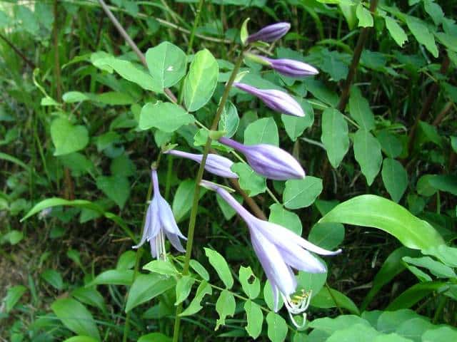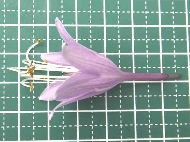 | 多年草 本州〜九州までの日当たりのよい湿地に生える。横にはう根茎がある。葉は多数根生し、斜上する。葉身は長さ10〜16cm、幅5〜8cmの狭卵形〜卵状長楕円形で先はとがり、基部は翼状になって葉柄に流れる。表面は灰緑色で光沢はなく、脈が凹む。花茎は高さ30〜40cmになり、淡紫色〜濃紫色の花を横向きに開く。花は長さ4〜5cmの筒状鐘形で、下半部は細く、上部は広がる。内側に濃紫色のすじがある。花の基部の苞は緑色で舟形にくぼんでいる。花期は7〜8月。(野に咲く花) 学名は、Hosta sieboldii キジカクシ科ギボウシ属 似た花に大型のオオバギボウシがある。 |
