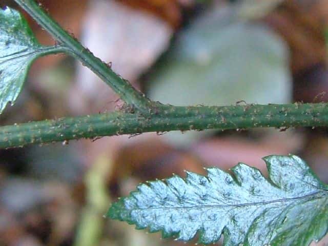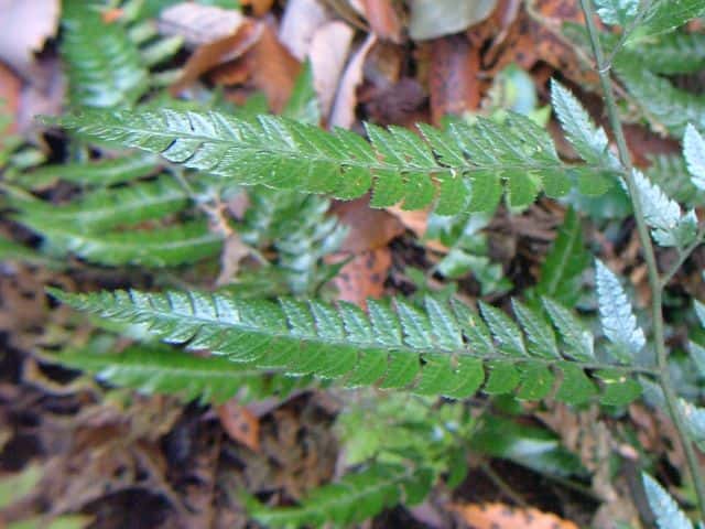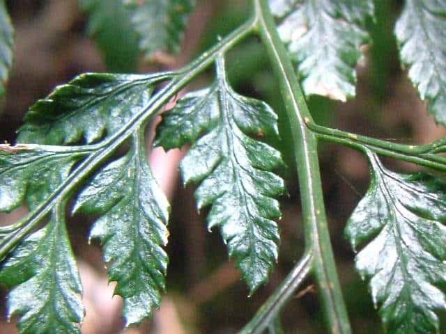 | ▼小羽片は切れ込む。 | ▼ソーラスは中肋よりにつく。 | ▼葉柄基部は線状の鱗片がある。 |