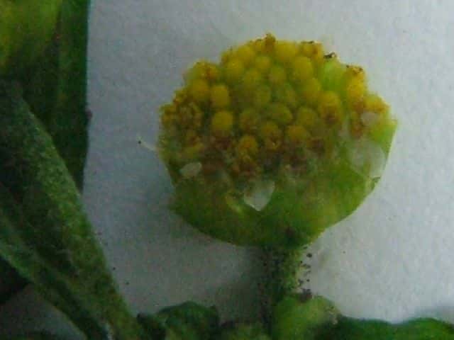 | ▼頭花は直径約5mm。 | ▼小さな舌状花が5個、多数の筒状花がある。 | ▼花柄には腺毛が密生する。 |