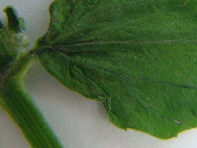 | ▼葉は長さ約3.5cm。 | ▼葉の裏面脈上に毛がある。 | ▼茎には開出毛がある。 |