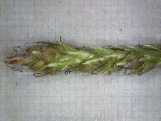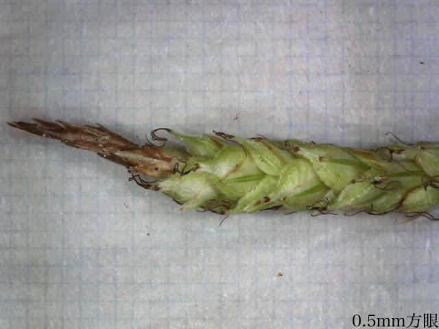| ▼小穂は雄雌性、先端の雄花部は短い。 | v小穂の先端部に雄花がつく。 | ▼先端部の雄花。 |